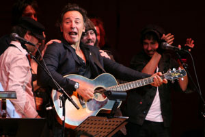 As for that NJN airing, we're reserving judgment until we see the DVD itself -- and we'll be looking for yours then, too, with a readers' poll. But we can't ignore reports we're hearing bemoaning the quick cuts that have been in vogue for far too long. Bill Kenney tells us: "Maybe it's not that bad, but the snippets I saw of Live in Dublin on the NJN fundraiser have the same claustrophobic feel the previous videos had on AOL (and right through the American Land DVD), and with that MTV-style choppy cutting to boot, that sucks the life out of what was a vibrant, buoyant, spacious stage show. Maybe it was hard to capture that feel, even with nine cameras, but I think the editing is repetitive, and the lighting seems really dark as well. But musically, there were some pretty cool versions of 'Growin' Up,' 'Further On (Up the Road),' a great 'This Little Light of Mine,' and promising clips of a bunch of others like 'Highway Patrolman,' and 'Atlantic City.'" Read more reports on BTX -- and if you've seen it, feel free to chime in.