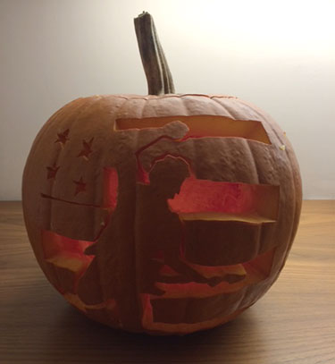 Third place: We received several variations on this theme, a silhouette of Bruce and Clarence, evoking poses from the Born to Run album cover to the Superbowl — honorable mentions go to Dave Montgomery and Neil Landers. But we awarded the third place ribbon to Chris Thinnes for his appealingly chunky carving, a big pumpkin for a big subject.