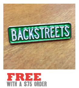The latest arrival at Backstreet Records: this iron Backstreets keychain, custom made for us by our friends at Print Mafia. It's a companion piece to the new enamel pin, which can be ordered separately, or get the keychain and pin together for a discounted price.