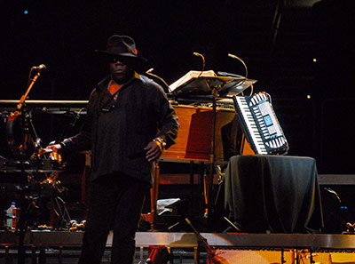 Legend opened with his majestic solo piano take on U2's "Pride (In the Name of Love)," and was soon joined by Bruce, Patti Scialfa, and India.Arie for his new song, "If You're Out There." After short sets from Legend and Arie, Bruce was back for a little acoustic set of his own, with solo readings of "The Promised Land" and "This Hard Land." In between he gave a version of his recent Vote for Change stump speech, saying that electing Obama was just the beginning to "taking back our country," and that it would take everyone "from Jersey, Long Island, and all points west" to rebuild this hard land. Joel followed with his band (which would be the backing band for the rest of the evening) for two of his own songs, "Miami 2017" and "Baby Grand."