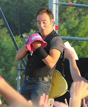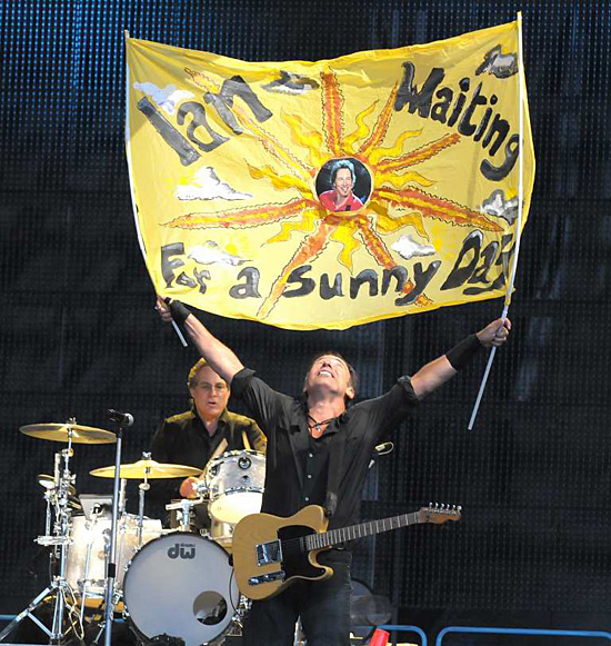 The show was highlighted by the return of "No Surrender," "Night," "Spirit in the Night" and "Trapped," all returning to the set list for the first time in a while. Powerful versions of "Seeds" and "Johnny 99" really got the crowd rolling, and when Bruce unfurled the first sign request"You ain't got the balls to play 'Great Balls of Fire'"it seemed as though it was just the challenge he was looking for. I think even the crowd was shocked when the band launched right into the 1957 classic (written by Otis Blackwell, but made popular by Jerry Lee Lewis). Not unlike "You Never Can Tell" a few nights earlier in Bilbao, the band nailed it, and raised the energy level even more. The second request was "blind," so to speak. Bruce held up a poster-sized "letter" addressed to him which he opened after "Great Balls of Fire," asking if he'd please play "Something in the Night," which was really well done. The third request was a bit of a birthday gift and a surprise, none other than "Surprise, Surprise" from Working on a Dream, with Happy Birthday wishes going out from Bruce to the 14-year-old girl who requested it.