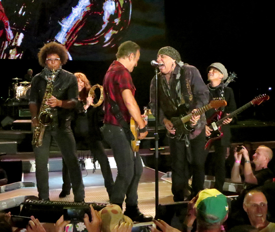 These Born in the U.S.A. rockers normally benefit from the momentum of a set in progress, so it was odd to hear them kick off an evening. But as Bruce drew a "99" in the air for another audible it was clear he was going with his gut, and his gut said roadhouse. The band modified accordingly and a trashy, honky tonk "Johnny 99" ensued with Soozie, Nils and Jake doing solos and joining Bruce on the pit stage lip to a stomping finish. An extended guitar duel during "Prove It All Night" made Steve smile while "Out in the Street" and "Hungry Heart" had Springsteen literally running the airport runway of a stage. "C'mon Jake!" yelled Bruce to a man 30 years his junior. And c'mon the sax man did, all for the sake of those "in the stands."